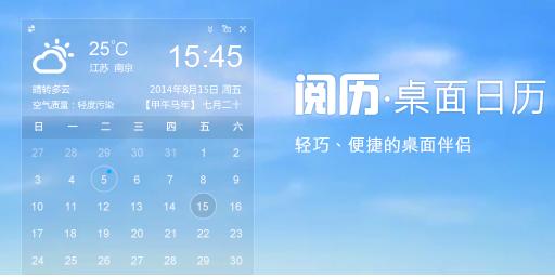 最新版本的体验台历是一款小清新风的桌面日历应用。最新版的体验台历没有广告,功能强大,有万年历、黄历、日常提醒等便捷功能。桌面日历版本还可以覆盖系统日历,显示空气质量和天气情况。也可以设置为引导或手动引导。
