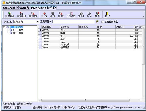 可以根据需求定义商品分类和管理,包括商品编码、商品名称、商品简写码、商品条码、商品规格、兑换积分等。