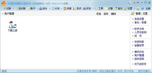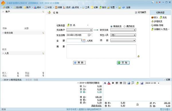 水滴家庭记账软件用于家庭和个人记账和财务管理。其主要功能包括记账、管理各种财产和债务、统计分析、收支预算、财务计划和提醒。软件设计适合家庭和个人,方便易用,支持个人记账、定期汇总整理、u盘记账。