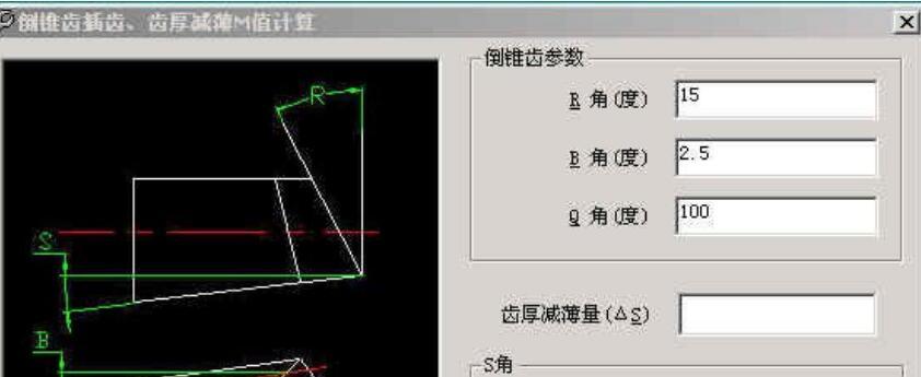 如上图所示,输入R角、B角、Q角计算S角(插齿刀工作台插入倒锥齿轮时倾斜的角度),按“计算补偿位移系数”计算补偿位移系数并传送到渐开线花键计算主窗口,然后计算插入倒锥齿轮时的花键参数。