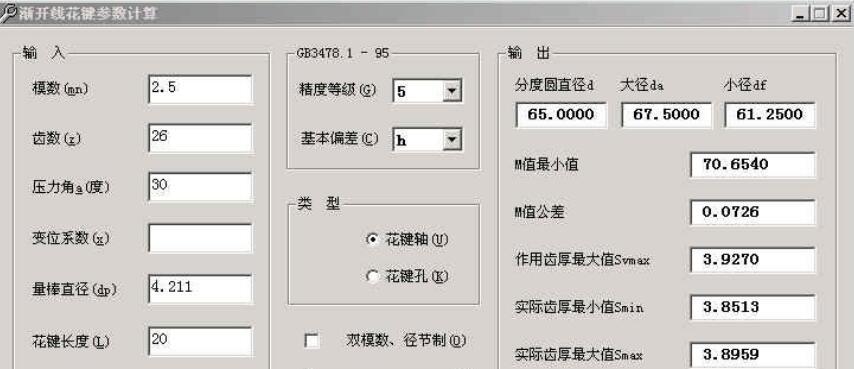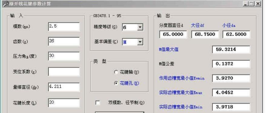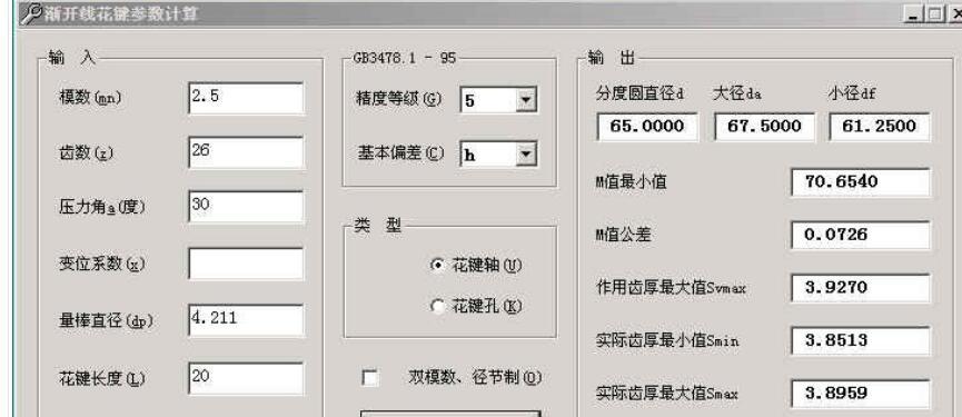 需要明确的一点是:计算双模量花键时,在“双模量和直径控制”前打勾,根据提示输入较小的模量值(输入前要将直径节距换算成模数)(较小的模数一般用于计算齿高)。