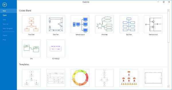 类似于Micsoft Office Suite的外观,该工具的主窗口允许您开始创建空白流程图、网络布局、思维导图或组织图,这允许您通过单击来选择首选的文件类型。