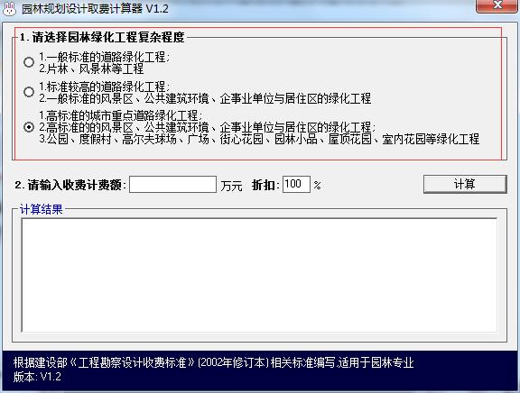 版本园林规划设计取费计算器支持园林绿化项目复杂程度的选择。