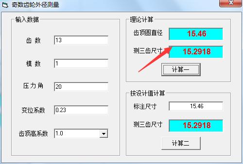 3.提示理论计算,结果是齿顶圆直径15.46,三齿尺寸15.2918。