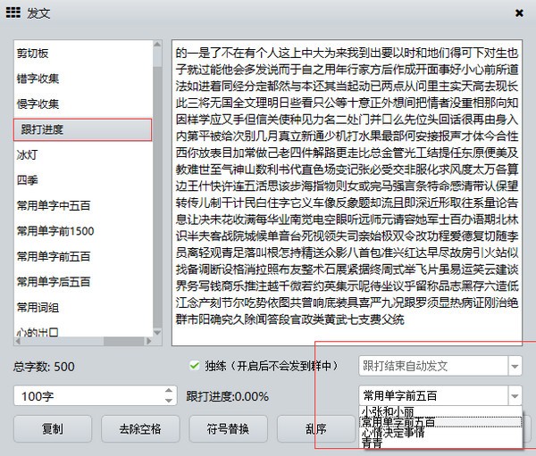 下面是网文,输入网文即可参与排行榜排名。选中文本后,可以点击选择全文,也可以在左下方输入每段要打的字数,然后点击发布。如果不想按顺序键入,请按CTRL+L来随机显示文本。(可以在快捷键设置中设置)