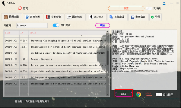 支持百度学术搜索,输入汉字,自动翻译成英文进行搜索。单击翻译按钮进行翻译,或选中自动翻译按钮进行自动翻译。致电sci-hub下载。
