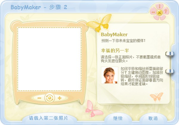 运行软件,然后加载两张图片,一张自己的,带一个物体,按要求调整大小和方向,然后选择人种肤色,希望是男生还是女生,然后继续看你未来的宝宝左右!