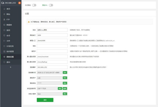 4.安装完成后,将会出现面板地址、默认值和密码。Ip:8888,输入密码使用宝塔。