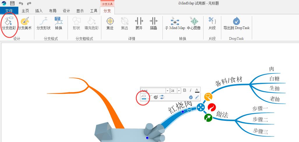 连接视觉和逻辑,颜色帮助大脑分类,强调,分析和识别更多以前未发现的联系。在iMindMap中,我们每次添加一个分支,它的颜色都不一样。选择分支,在打开的分支工具栏和工具窗口中,我们可以使用相应的颜色工具来调整分支颜色。