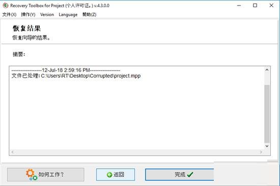 在恢复过程的最后一步,程序会自动恢复损坏文件的数据,并将其发送到Micsoft Pject,这样您就可以立即编辑您的项目,并将其保存到安全的地方。