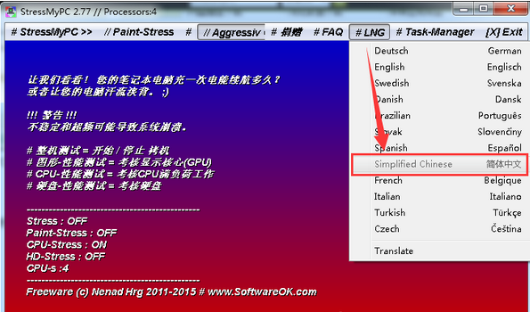 测试CPU和U能压力(StressMyPC)是一个测试cpu、硬盘、显卡等电脑硬件设置的使用效率的工具。包含了显卡使用率,CPU使用率,内存使用率及硬盘的压力监控。除此之外,还具有调节使用率功能,能使硬件使用率达到100%。