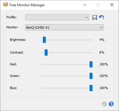 免费显示器标记将自动识别您的显示器,并默认显示当前方案。您可以拖动软件底部的滑块来调整亮度、对比度和RGB值。如果每次都想快速调整,可以设置后点击右上角的“保存”按钮保存为方案,下次可以快速切换方案。右下角的“设置”按钮可以用来设置快捷键,快速增加或减少亮度和对比度。