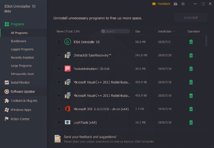 你可能会注意到,随着时间的推移,你的电脑越来越慢。一些原因是程序无法删除,未使用的程序和卸载程序的残余积累在内存中。IObit卸载程序可以帮助你完全快速地卸载顽固的程序及其残留物。即使是Windows 10和Windows 8中不受欢迎的应用程序也可以轻松删除。