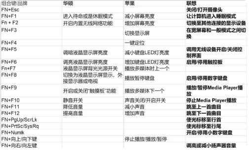 2.FN键的作用是什么?单独的FN键不起作用。需要配合其他按键做一些方便的工作。它是一个纯组合键,就像Ctrl键一样。小编用下图说明FN键在几大品牌笔记本中的使用情况,供大家参考。