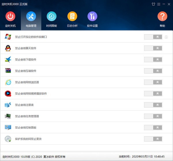定时关机3000下载可以定时自动关机,安排任务,禁止上网聊天,禁止运行自己设置的软件(如游戏)+禁止浏览网页+禁止在指定时间段使用电脑+禁止在指定时间段上网。