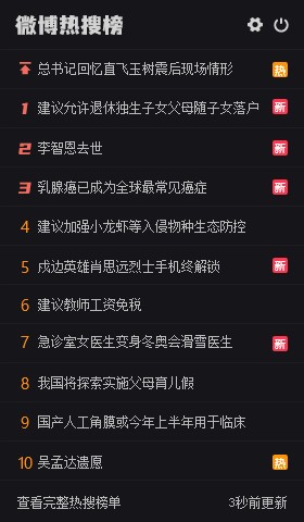 微博热搜榜桌面小工具是网友开发的桌面微博热搜软件。它可以实时监控微博上的最新热点新闻,快速吃瓜,直接查看十大热搜榜,还能查看完整榜单!