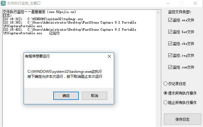 文件执行监控是网友制作的电脑程序监控程序。它可以用来检测一些可以运行的应用程序,防止未知软件运行。在运行之前,会根据自己的需要询问用户是否运行。