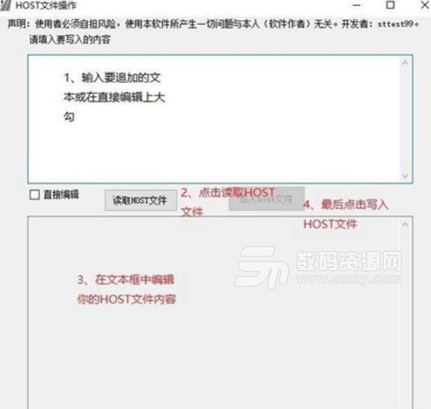 添加初始文档,可以在同一个目录下的hosts.txt中填充要写入的文本,在程序启动时自动读入文本框,实现半自动填充功能。
