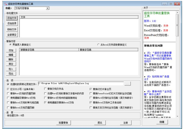 超级字符串批量替换工具是一款文档内容批量替换工具,支持多种常见office文档格式的内容替换:文本/超文本文件(*。html*.txt*.htm)、office文档:Word文件(*)的批量内容替换。doc)、Excel文件(*。xls)和PowerPoint幻灯片文件(*。ppt)。