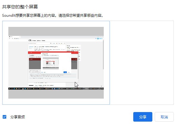 点击激活声音流按钮,会弹出一个共享屏幕和音频的弹出窗口。选择上面显示的屏幕预览,然后点按“共享”。