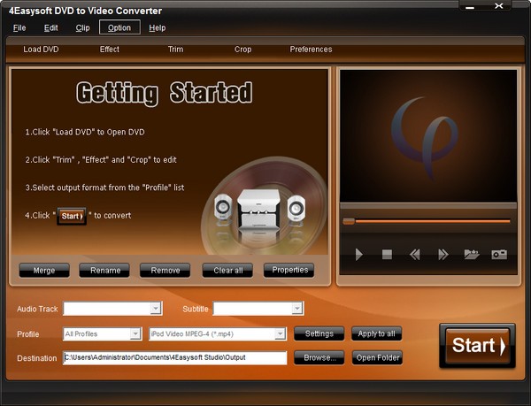 4Easysoft DVD to Video Converter是一款多功能的DVD转换器,可以帮助你将DVD转换成I、MP4、WMV、MOV、M4V、FLV、SWF、3和HD H.2、HD I、HD MPG、HD TS、HD WMV、HD MPG、HD MOV、HD ASF等。这个DVD-to-DVD转换器可以将DVD转换成您的便携式播放器。