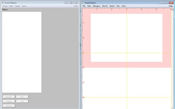 Praat程序由外围和核心两层组成。外围主要包括对象窗口(标题为Praat对象)、图片窗口(标题为Praat图片)、脚本编辑器(ScptEditor)、ButtonEditor(数据编辑器)、窗口(信息窗口)和手动。