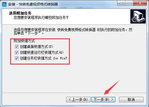 4.选择附加任务:这里我们可以看到有三个选项,分别是创建桌面快捷方式、创建快速运行栏快捷方式、创建任务栏快捷方式等。在这里,大家可以根据自己的需求进行选择,点击下一步;