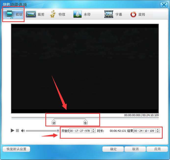 3.在“截取”窗口中,可以通过拖动进度条上的两个按钮来选择剪辑,也可以点击播放预览。对截取感到满意时,单击确定。如下图所示。