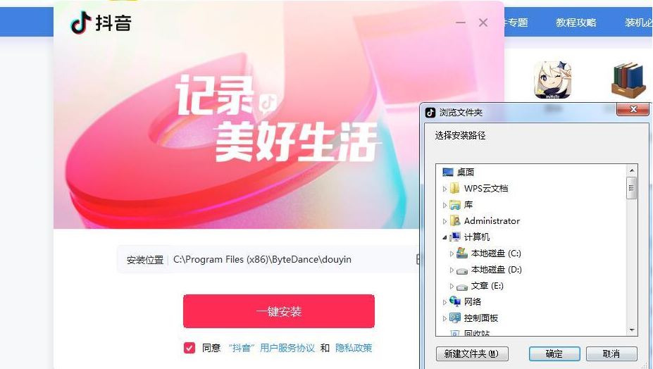 抖音PC版默认安装位置在c盘的文件夹中,点击浏览将安装程序的文件夹替换为另一个驱动器,勾选同意抖音用户服务协议和隐私政策。单击一个按钮进行安装