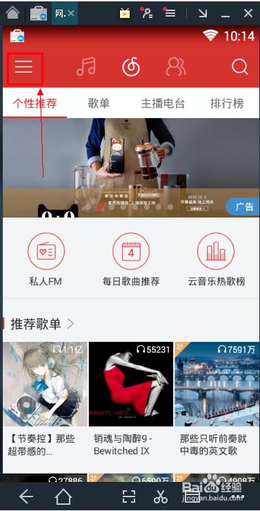 4.打开云音乐软件后,点击软件左上角三个横条的图标。