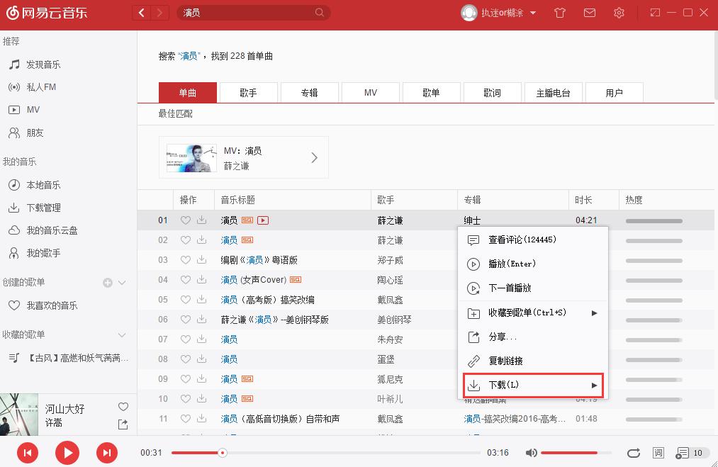 3.找到想听的歌曲后,就可以看到歌曲的详细介绍了。如果想下载这首歌,可以点击鼠标右键,在弹出的选项中点击【下载】。