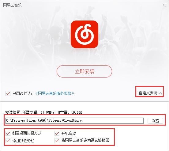 2.或者可以点击安装界面右下角的【自定义】进行安装,点击【浏览】。在打开的安装界面中,可以自行选择软件的安装位置,可以勾选“创建桌面快捷方式”、“从电脑启动”、“添加到任务栏”、“将云播放器设置为默认播放器”,都可以自行选择,选择完成后点击“立即安装”。