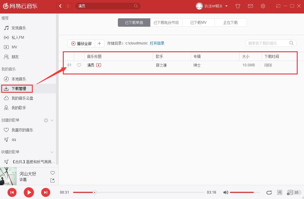 5.点击云音乐电脑版左侧的【下载管理】,也可以看到自己下载的音乐文件。