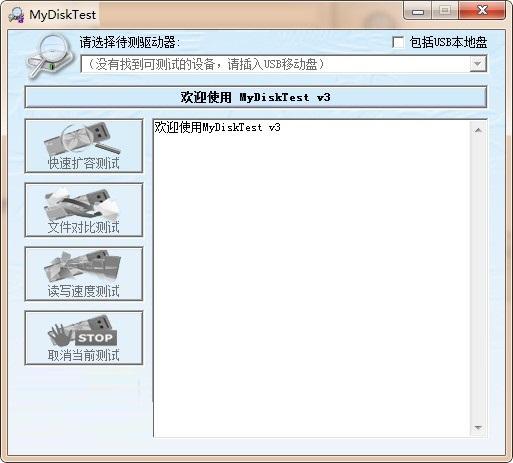 1.首先进入MyDiskTest主界面。此时,没有插入存储设备。软件将提示您插入要测试的设备。