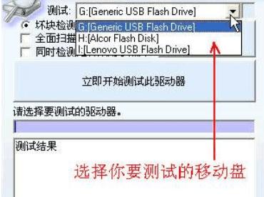 2.MyDiskTest自动检测所有插入的可移动磁盘,并选择要检测的磁盘。