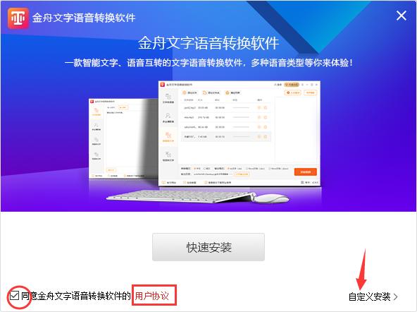 1.在本网站下载金舟文字语音转换软件安装程序,双击。exe程序开始安装,点击查看用户协议,选择同意,点击自定义安装,进入自定义安装界面。