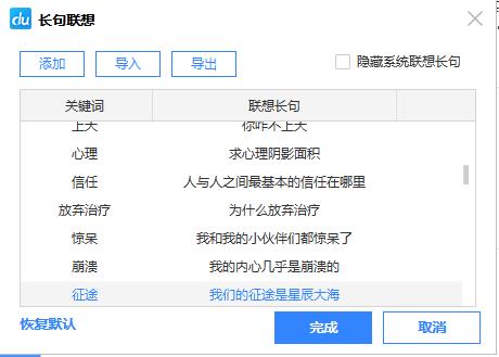 2.长句联想功能,可以在你输入几个汉字后,立即添加互联网山中流行的长句或者你常用的长句。