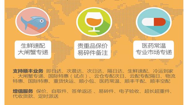 与顺丰对接,支持包月结算,支持顺丰速运、顺丰优选、顺丰速运、顺丰次日达、生鲜冷运、大闸蟹专送、医室温等18项以上特色服务。还支持保价、易损件、超长超重、定时配送等增值服务。快速反应,优质服务