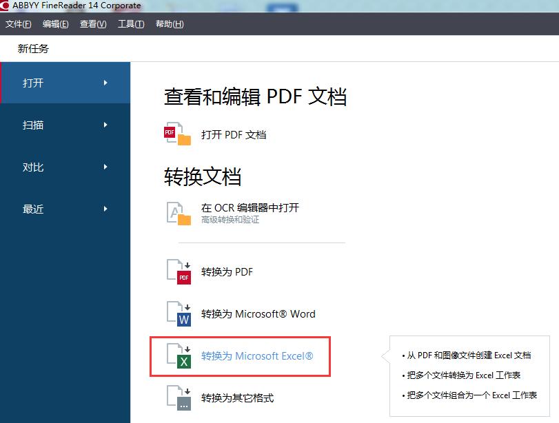 1.打开FineReader 14软件,单击“打开”选项卡,然后单击“转换为Micsoft Excel”。