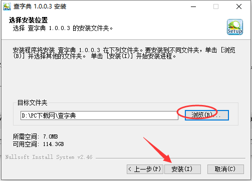 2.软件的默认安装位置是“C:/Pgram Files (x86)/查字典”。点击“浏览”选择另一个安装位置,选择安装位置后点击“安装”。