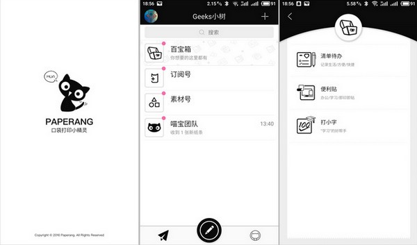 无论你想打印手机里的照片、表情、网页还是标签,你需要做的就是打开手机连接打印。另外这台打印机需要相应的APP才能运行,比较专业。这里简单介绍一下这个软件。第一次需要扫描说明下载相应的APP应用软件。本机采用蓝牙技术连接,支持Andid系统/IOS两大主流系统。第一次需要注册绑定登录,入门非常简单。除了简单的打印功能,界面的亮点还包括百宝箱、订阅号、素材号,以及千变万化的有趣玩法。