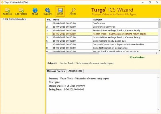 Turgs ICS Wizard版是一款功能强大的ICS文件转换软件。Turgs ICS Wizard最新版本可以将ICS转换成MSG、EML、EMLX、MBOX、MHT、XPS、RTF、DOC、PST等。版本Turgs ICS Wizard可以自由保存转换后的数据在电脑上的任何地方,也可以保存转换后的文件。