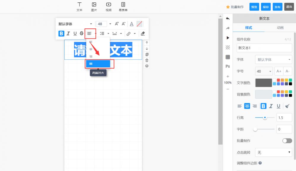 3.双击文本修改文本对齐方式,包括:两端对齐。