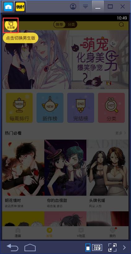 1.双击打开已安装的快看漫画软件,点击如图位置切换男生女生布局。