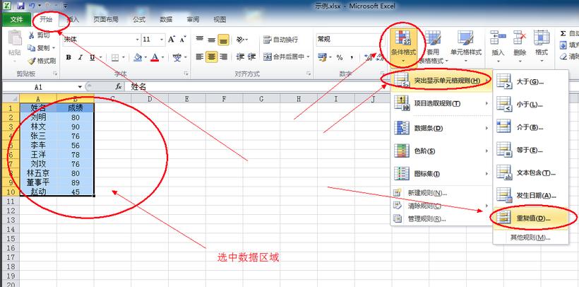 1.双击打开要处理的Excel文件。打开后选择要处理的数据区域,点击开始菜单,然后选择条件格式,在弹出的下拉菜单中点击高亮单元格规则,然后选择重复值选项。