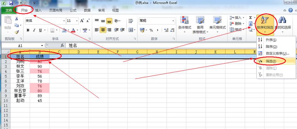4.选择Excel数据表的表头行,点击菜单栏中的开始,然后选择排序和筛选,从弹出的下拉菜单中选择筛选。如果没有标题行,请在前面插入一行,并选择一个空行作为筛选行。