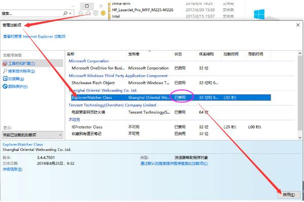 第二,如果没有安装安全软件,在IE中启用TabHelper(Explorer Watcher)插件。以IE11为例,在设置中,找到【管理外接程序(M)】——显示在左下角。您可以选择[所有加载项]来查找Explorer Watcher类。如果当前状态为禁用,那么将对该插件执行[启用(E)]。下图是一个指南: