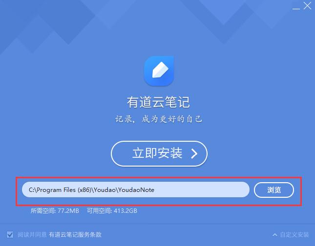 1.在本网站下载最新版本的有道云笔记安装包,双击运行。您可以单击“自定义安装”并选择要安装的目录。单击立即安装。
