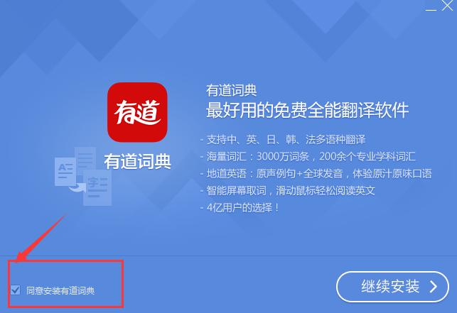 3.如果不需要,可以不勾选,同意装字典。选择继续安装,耐心等待软件安装完成,就运行了。