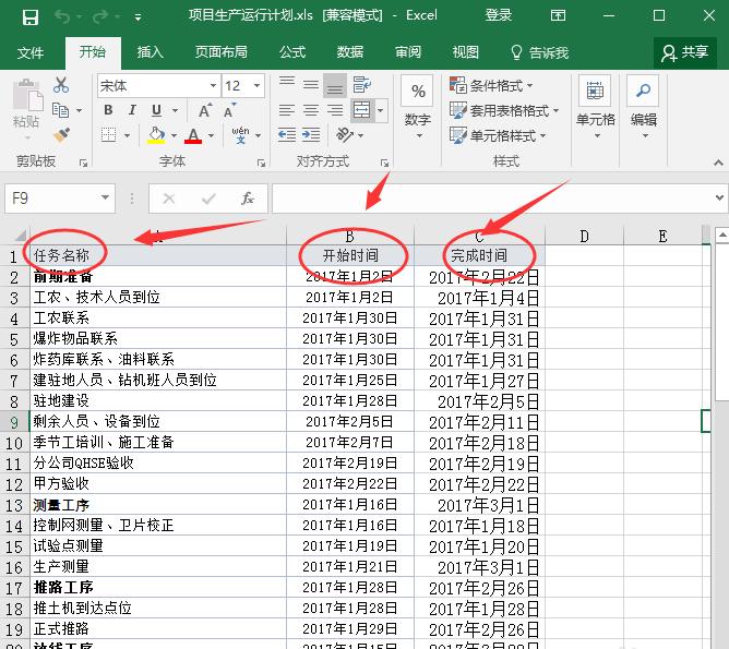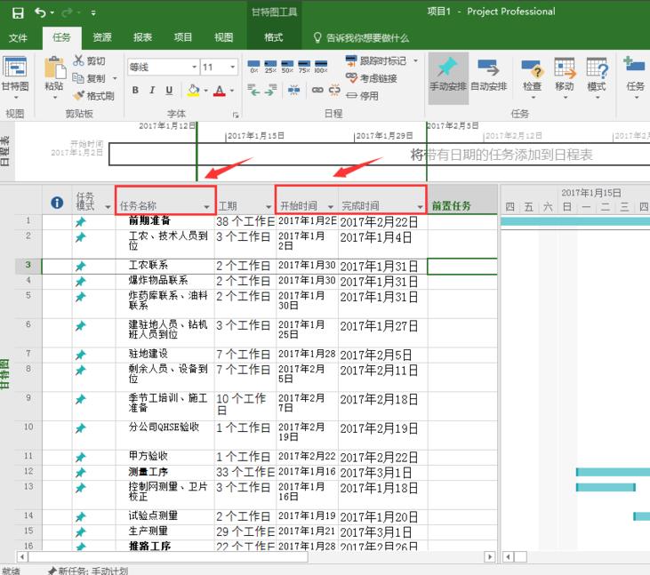 3.接下来,我们将按照下图所示的顺序,将第一步中excel表格中的任务名称、开始时间、完成时间一步步复制到pject 2016软件中。复制完成后,会自动生成施工工期。粘贴完成后,甘特图进度可以显示在下图的右侧。